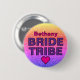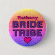 Lindo Broche para a despedida de solteira. Na parte superior do broche, em letras rosa com contorno preto, está o nome da amiga; este é um modelo para substituir o nome de exemplo na caixa de texto pelo seu. Abaixo, em texto roxo com contorno preto, estão as palavras Bride Tribe (Tribo da Noiva). Na parte inferior do broche, há um coração rosa com contorno preto para completar o visual. O fundo é um design de brilho falso em um gradiente de amarelo, rosa e roxo.