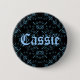 Bonita design intrincada em preto e azul num botão que diz "Cassie". Você pode substituir este nome por seu próprio.