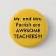 Um botão que diz, o "Sr. e a Sra. Parrish são os PROFESSORES IMPRESSIONANTES!!!"