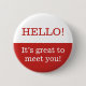 Este design de botão vermelho e branco apresenta as mensagens "OLÁ!" e "É excelente te conhecer!". Talvez pudesse ser usada como uma forma amigável de saudar as pessoas.