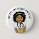 Apresente-se aos seus doentes com este botão de nome fácil de ler. Desenho de desenho de uma enfermeira de cor em esfregões de pele.