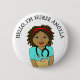 Apresente-se aos seus doentes com este botão de nome fácil de ler. Desenho de desenho de uma enfermeira de cor em esfregões de pele.