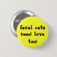 o botão com "os gatos ferozes precisa o amor demasiado!" slogan nele.