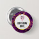 Botão de menina de aniversário com um lindo padrão de abstrato com um design de mármore. As cores roxas ricas se misturam, combinadas com fitas giratórias douradas e misturadas em toda a design. Um círculo com uma falsa borda de folha de ouro colocada sobre cima com seu dentro de texto, assim como um balão de cor-de-água rosa com o dentro da idade da garota de aniversário.