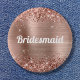 Um botão feminino para as damas de honra na sua festa de casamento. Todo o texto elegante do estilo caligrafia moderno é personalizável. O plano de fundo apresenta rosa dourado falso e folha de papel cor-de-rosa pincelada com brilho falso cintilante. Estes elementos digitais são impressão como uma foto.