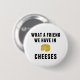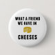 Declara o teu amor pela delícia leiteira com este pequeno botão. Um design engraçado e retrô apresenta uma ilustração de roda de queijo amarelo e "What a Friend We Have in Cheeses" em bloco preto.