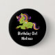 Botão da garota de aniversário com uma imagem de um unicórnio estilo Frankenstein. Cor roxa e verde. Muito fofo.