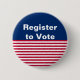 Este botão tem um campo azul no topo com a palavra "registre-se para votar" em letras brancas. Tem listras vermelhas e brancas no fundo que lembra a bandeira americana. Os botões de votação personalizáveis vermelho, branco e azul suportam os esforços de votação e/ou registro de eleitores.