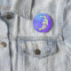 Este botão de pino traseiro redondo tem uma lua crescente branca rico com um rosto que tem olhos azuis e lábios cor-de-rosa e formas abstrato de cor brilhante em roxo, azul e amarelo.