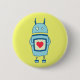Botão robot bonito com uma ilustração cartoon de um robô cartoon azul desajeitado segurando uma placa com um coração sobre fundo amarelo brilhante. Este botão robô é adequado para crianças e geeks que adoram robôs e ilustrações bonitas.