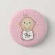 Um botão e um ímã adoráveis do bebê que caracterizam um bebé que veste um babador florescido cor-de-rosa contra uma polca cor-de-rosa e branca pontilharam o fundo. Personalize-os no ponto com um nome ou o outro texto!