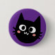Engraçado crachá roxo com um gato preto de desenho cômico com grandes olhos redondos e bochechas rosadas rosadas no estilo de desenho de rabisco.