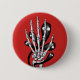 Botão de mão do esqueleto com uma ilustração gráfica de uma mão de um esqueleto com fantasmas pretos assustadores com olhos brilhantes girando ao seu redor sobre um plano de fundo vermelho vulgar.