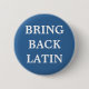 Um crachá azul "Traga de Volta para Latim". Um relatório recente publicado no Reino Unido recomendou que o latino fosse ensinado nas escolas primárias. O latim, o grego antigo e os clássicos em geral costumavam ser muito populares, mas têm declinado nas últimas décadas, pelo que apenas um punhado de escolas públicas os ensinam agora. Use este adesivo para mostrar seu apoio à campanha para trazer línguas antigas de volta às escolas britânicas!