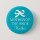 Aqua personalizada/mãe azul e branca de turquesa dos botões de crachá do nome da noiva com fita de arco pequena e fonte elegante. Excelente para festa de solteira rico, chá de panela elegante, final de semana de meninas divertidas e belos casamentos. Design clássico. Pinos fofinhos! Faça o seu próprio para a empregada, madrinha de casamento, matrona de honra, florista, mãe da noiva, mãe do noivo e outros membros da comitiva, etc. Acessórios de planejador de casamento para a tripulação da noiva. Cor personalizável.