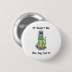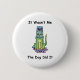 Botão com uma ilustração mostrando um gato com aspecto rabugento sentado com uma xícara de plástico presa na cabeça como um capacete. É uma tomada humorística, ligeiramente sarcástica sobre gatos, desajeitada, e aqueles momentos "claro que isto aconteceria comigo".
