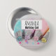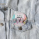 Botão da garota de aniversário com uma fotografia bonito e colorida. Apresentando artigos decorativos em azul pastel, rosa, pêssego e amarelo. Colocada sobre uma mesa de madeira com pequenas miçangas coloridas. Um retângulo branco com uma borda cor-de-rosa colocada sobre cima com seu dentro de nome personalizado (e título).