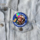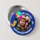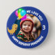 Foto personalizável, nome, idade e texto - FELIZ ANIVERSÁRIO / NÓS O AMAMOS - botão. Um quadro azul com letra branca e um dino fofo está segurando balões. Adorável.