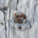 Este botão apresenta 3 ouros de wyandottes lacrados que são irmãs de rebanho e brigam sobre quem vai receber o assento do pote de flor primitiva! Bonita e humorística!