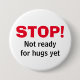 Botão branco moderno com uma mensagem simples que diz STOP, NOT READY FOR HUGS AINDA em vermelho e preto. O texto preto é PERSONALIZÁVEL, para que você possa criar sua própria mensagem pessoal de 'Mantenha-se Fora'! Uma maneira ideal de apagar o dilema do abraço ou do cotovelo. Disponível em outras cores.