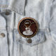 Botão com um design artístico de café turco sendo derramado em uma xícara. Fundo mosaico castanho com ouro de borda rolada.