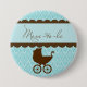 Botão elegante e chic para a futura mãe apresentando uma cor damasco azul de riptide sobre um fundo de azul de onahau com a imagem de uma carruagem de bebê. O texto diz "Mamãe-to-be" e é escrito em uma faixa escamoteada ornamental em azul e marrom. Trabalho de arte criado por Babystar Design.