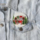 Botão com um tema de Natal bonito e caprichoso. Um trailer aconchegante decorado para o sorteio de Natal entre alguns pinheiros.