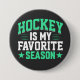 Botão de hóquei com texto verde e branco sobre fundo preto lê Hockey é Minha Estação Favorita!