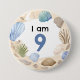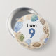 Comemore um nono aniversário com este crachá. Com as palavras "eu sou 9" e uma fronteira de conchas marinhas, algas e areia, o botão é branco com um número azul nove. Um cúmplice bonito para a criança de aniversário.