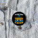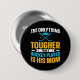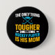 Botão do tema do hóquei para a mãe de hóquei com paus de hóquei e paus com texto de branco, amarelo e azul que lê A única coisa mais forte que um jogador de hóquei é sua mãe!