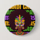 Botão na moda MARDI GRAS Afro Queen nas cores populares de roxo, ouro e verde com fundo preto. A design mostra uma mulher negra com grande distância e vestindo uma máscara. A expressão MARDI GRAS é repetida nas mesmas cores em segundo plano. O botão Ideal Mardi Gras para usar nas ruas de Louisiana, Nova Orleans, Brasil e qualquer lugar é celebrado.