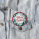 A Christmas button with "Merry Christmas" written in scarlet script with a silver and turquoise background.