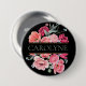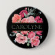 Um botão personalizado apresenta um monograma, um estilo elegante de vassoura, design floral com lindas peônias de francês cor rosa, flores de aquarela e verde-verde. Paleta de tons cor-de-rosa, laranja e azul claro. Personalize com um primeiro nome.