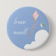 um texto branco sobre azul no botão de tema nuvens com pipas e pássaros para um chá de fraldas de menino ou menina