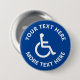 Botão do pino traseiro do ícone da cadeira de rodas, sinal personalizado de deficiência. Faça seus próprios botões de sinal personalizados. Símbolo azul e branco desativado com modelo de texto.