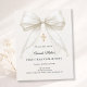 Celebrate your daughter's milestone with this elegant First Holy Communion invitation. This design features a stunning, oversized ivory silk bow adorned with delicate pearl strands and a central ornate gold cross. It is the perfect choice for a traditional Catholic ceremony or a sophisticated religious celebration for a young girl.