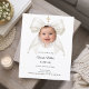 A white background, decorated with a large ivory colored bow with pearls and a golden cross. Personalize and add a photo, name and details details.