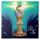 A tigela de Higieia (Hygiea) é um dos símbolos da farmácia, química, química ou farmácia. Higieia era a deusa da saúde, filha do deus da medicina, Asclepius.Elegant, design artística, colorida com, uma serpente ouro entrelaçada em torno de um antigo cálice, pedras brilhantes em luzes vibrantes e ondas fractais em cores azul aqua, azul turte, teal, branco amarelo. design legal e vibrante, personalizável para a sua empresa.
