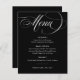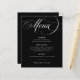 Este elegante e negro cartão de noiva de orçamento negro apresenta o estilo clássico do velho mundo com caligrafia branca romântica. Adicione suas opções de janto para iniciantes ou aperitivos, primeiro curso, prato principal ou entrada e sobremesas. Defina o tom para a sua sofisticada Itália inspirando recepção de casamento ou janto de ensaio, ou ofertas de comida chá de panela, com esta classe, minimalista.
