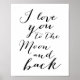 A tipografia é preta, eu te amo na Lua e na poster de trás impressa em fundo branco mate. As dimensões do impressão de sinal (poster) são de 8 por 10 polegadas.
