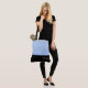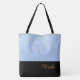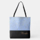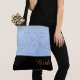 Esta bela bolsa de tote de moda à frente mostra a palavra "Noiva" em uma cor de texto Ouro-Caramelo sobre Preto com a bolsa de tote superior em Azul Claro com estrelas de Ouro pequeno por todo o lado. Tem bastante espaço para texto personalizado. Os gráficos e o texto estão em ambos os lados desta bolsa de tote. Alça preta. Personalize mais ou mais comprares, conforme mostrado.