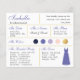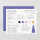 Um cartão de informação da madrinha para um casamento roxo e dourado, incluindo informações sobre a data e a localização do casamento, as cores do casamento, a festa noiva, o vestido da madrinha e uma mensagem de proposta da madrinha. O nome da madrinha e os títulos são escritos em uma escrita violeta elegante. No canto inferior direito, há um vestido violeta. No centro, há as cores do casamento em círculos. As cores, incluindo a cor do vestido de noiva, podem ser alteradas, com exceção do círculo dourado, que é a folha de ouro falsa. As cores padrão são azul marinho, violeta (roxo), lavanda (roxo claro), rosa-pincel e ouro. As costas são lavandas, como a cor do vestido da dama de honra.