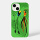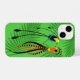 Arte vetorial colorida de um par de aves exóticas ficcionais do paraíso com penas longas de cauda e plumagem brilhante numa selva verde como o fundo.