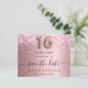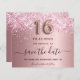 Uma garota e moda Salve o cartão de data para uma doce festa de aniversário 16, 16. Leve fundo metálico de aspecto fino, cor-de-rosa, decorado com poeira luminosa rosada. Personalize e adicione uma data e um nome/texto. O texto: Salvar a Data é gravado com um script de estilo com letra de tendência grande com alternâncias. Número 16 com uma fonte rosa dourada no estilo do balão.
