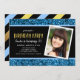 O Convite de aniversário Blue Glitter Photo apresenta as palavras "Festa de aniversário" em uma fonte sans serif divertida em uma folha de ouro falso com uma luz azul de cima e de baixo e um fundo central preto. O convite tem um padrão de tiras de folhas de ouro azul, pretas e sujas no verso. Personalize-o substituindo o texto do marcador de posição e substitua a foto do marcador de amostra/marcador de posição por sua própria foto. Para obter mais opções, como alterar a fonte e seu tamanho/cor ou o espaçamento entre letras, clique no botão "Personalizar". *Observe que a Marca d'água do Zazzle que aparece na visualização de zoom NÃO aparecerá no produto impresso final. © Rosewood e Citrus