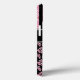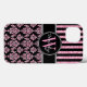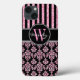 Cor damasco de vinheta, monogramada, girada, preta e rosa, com gráfico brilhante impresso, padrão de listras pretas e uma etiqueta de círculo decorativo que você pode personalizar adicionando seu nome e monograma inicial em lindas fontes de script. Design por Elke Clarke© para a Galeria de Monogramas. Para outras cores de fundo brilhantes, entre em contato com o designer.