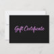 Este certificado de presente contém as palavras "Certificado de presente" em brilho roxo falso contra fundo preto na frente. Personalize-o substituindo o texto do marcador de posição e a imagem do marcador de posição pelo seu próprio logotipo. Para obter mais opções, como alterar a fonte, seu tamanho e espaçamento entre letras, clique no botão "Personalizar". *Observe que a Marca d'água do Zazzle que aparece na visualização de zoom NÃO aparecerá no produto impresso final. © Rosewood e Citrus