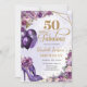Convite de aniversário de 50 anos fabulosos, projetado em um estilo luxuoso e elegante. O ponto central do design é o número "50" e a palavra "Fabuloso", ambos renderizados em uma textura de glitter dourado brilhante e fonte de letra elegante. Arranjos florais que apresentam uma mistura de flores roxas, mauves e rosadas, incluindo rosas e outras flores. Um par de sapatos de salto alto roxos brilhantes é adornado com um buquê de flores correspondentes, e um par de sapatos de salto alto roxos brilhantes é adornado com um buquê de flores correspondentes,