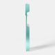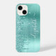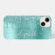 Capas de iphone elegante e giro personalizada com brilho verde de menta gota em fundo metálico esfregado. Personalize com seu nome em um roteiro branco de tendência de na moda com baloiços.