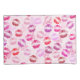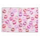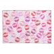 Beijos multicoloridos manchados com batom em fundo rosa